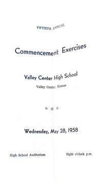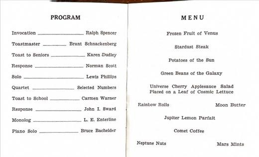 Lost in Space Prom | April 25, 1958 · Valley Center The junior-senior banquet and prom carried a space-age theme: Lost in Space. The program listed the evening’s menu and entertainment, with the dance running late into the Kansas night. Sputnik had launched in October 1957, and outer space was on every teenager’s mind. Valley Center put it on the prom program and called it a night. |  “Lost in Space” Prom Program · April 25, 1958 [view original] |